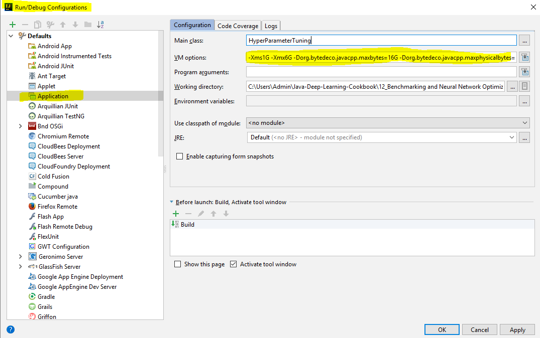 For example, in IntelliJ IDE, we can add VM arguments to the runtime configuration: