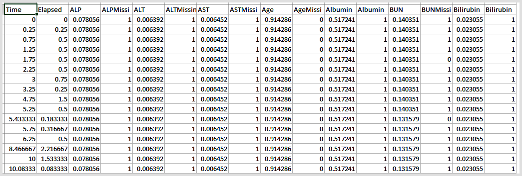 Time series data is three-dimensional. Each sample is represented by its own file. Feature values in columns are measured on different time steps denoted by rows. For instance, in step 1, we saw the following snapshot, where time series data is displayed:
