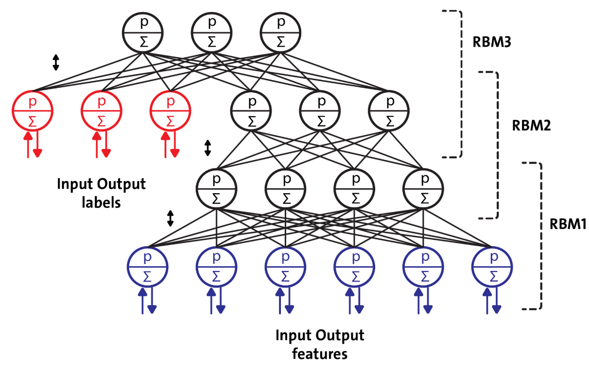 DBNs are composed of a visible layer and multiple layers—hidden units. The top two layers have undirected, symmetric connections in between and form an associative memory, whereas lower layers receive top-down, directed connections from the preceding layer. The building blocks of a DBN are RBMs, as you can see in the following figure, where several RBMs are stacked one after another to form DBNs: