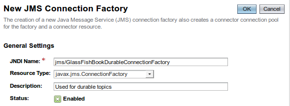 Like we mentioned before, the easiest way to add a connection factory is through the GlassFish web console. Recall that, to add a JMS connection factory through the GlassFish web console, we need to expand the Resources node on the left-hand side, then expand the JMS Resources node, click the Connection Factories node, then click the New... button in the main area of the page. Our next example will use the settings displayed in the following screenshot: