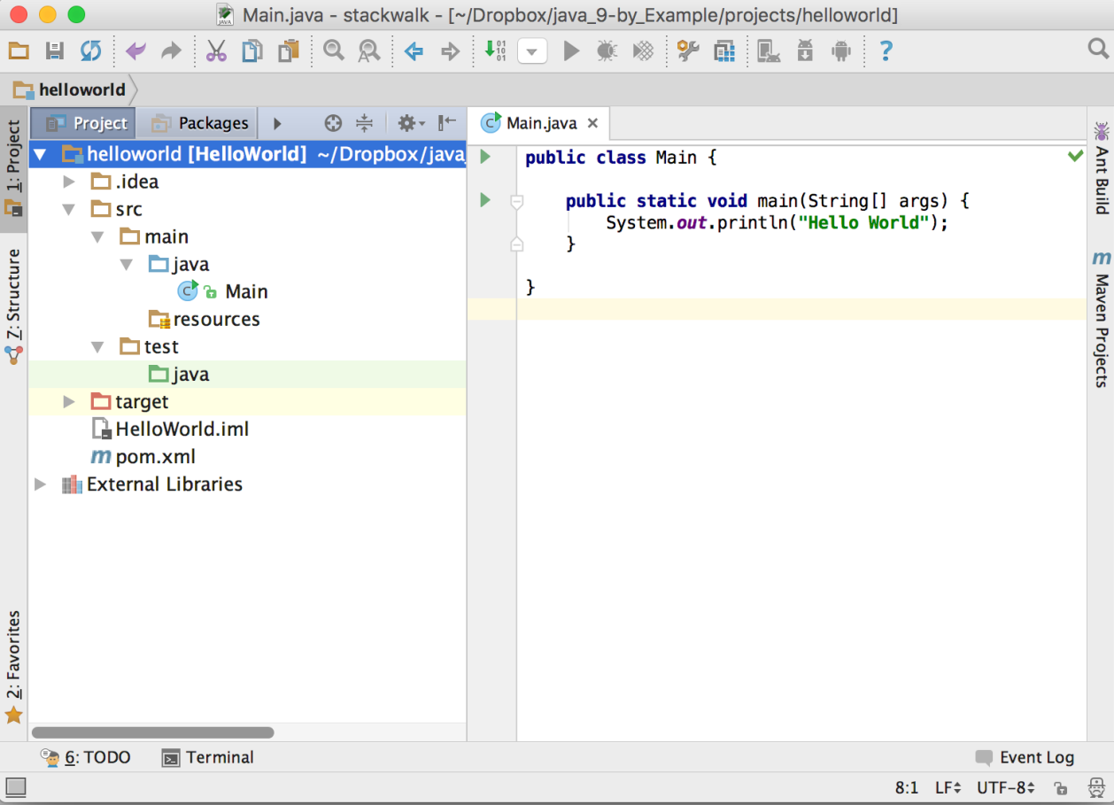 On the left, you can see the file structure of a Java project. A Java project typically contains many files in different directories, which we will discuss in the next chapter. The simple HelloWorld application contains a pom.xml project description file. This file is needed for the Maven build tool, which is also a topic for the next chapter. For now, you should only know that it is a file that describes the project structure for maven. The IDE also keeps track of some administrative ...