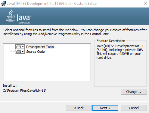 Pressing the Next button gets a window where you can select the parts you want to install, and also, we can change the location where Java will be installed: