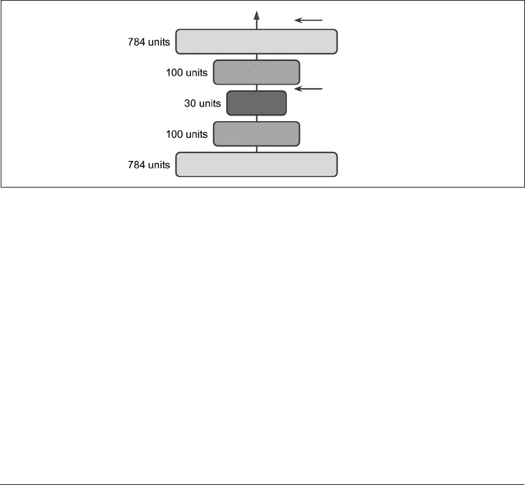 100 个神经元的另一个隐藏层,以及有 784 个神经元的一个输出层。这种堆叠式自动编