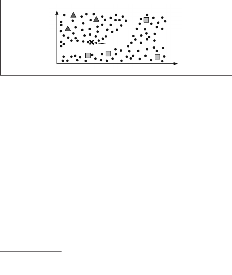 图 1-11 :半监督学习有两个类别(三角形和正方形):未标记的示例(圆形)有助于将新实例