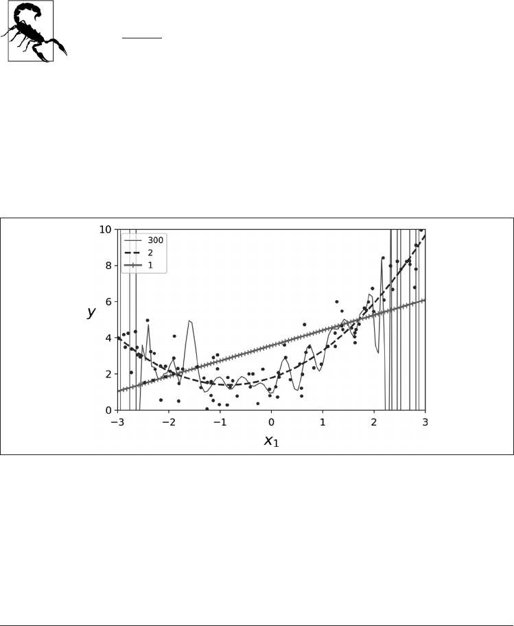 项式)进行比较。请注意 300 阶多项式模型是如何摆动以尽可能接近训练实例的。