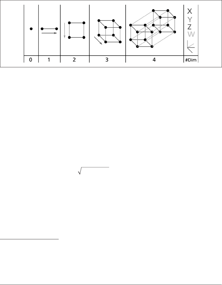 图 8-1:点、线段、正方形、立方体和网格(零维至四维超立方体)