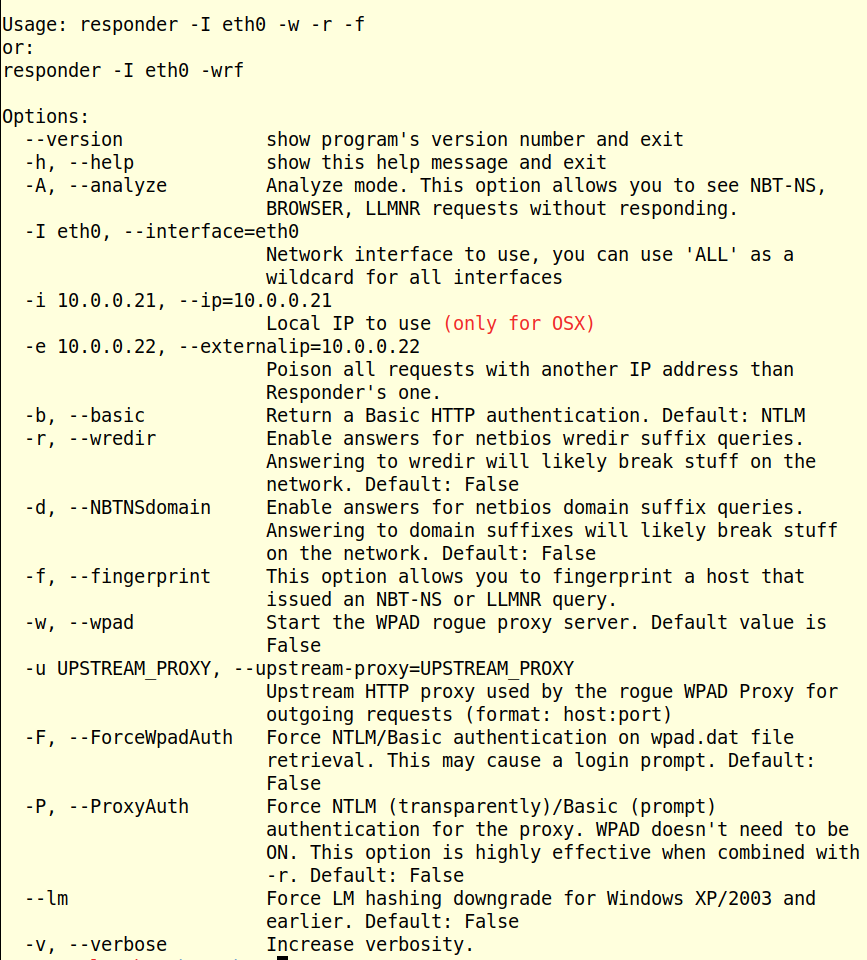 Responder.py is a Python tool that attacks just about all vectors of NTLM and the SMB protocol. In the following screenshot, we have the Responder Help file. We will go over some of the options and their uses.