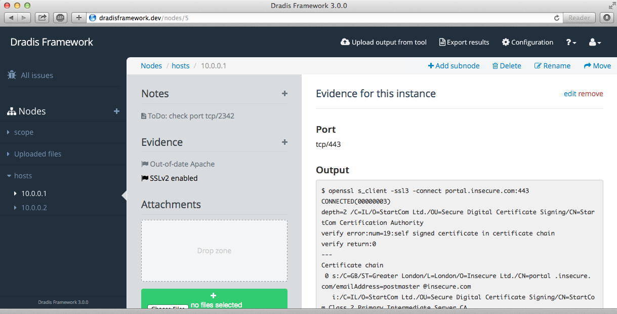 Dradis is a web application, and can be used to share documentation with a team. The default URL for Dradis is https://127.0.0.1:3004. The application can be hosted on a remote secure server, and that is the best feature about Dradis. The following screenshot comes from http://dradisframework.org.