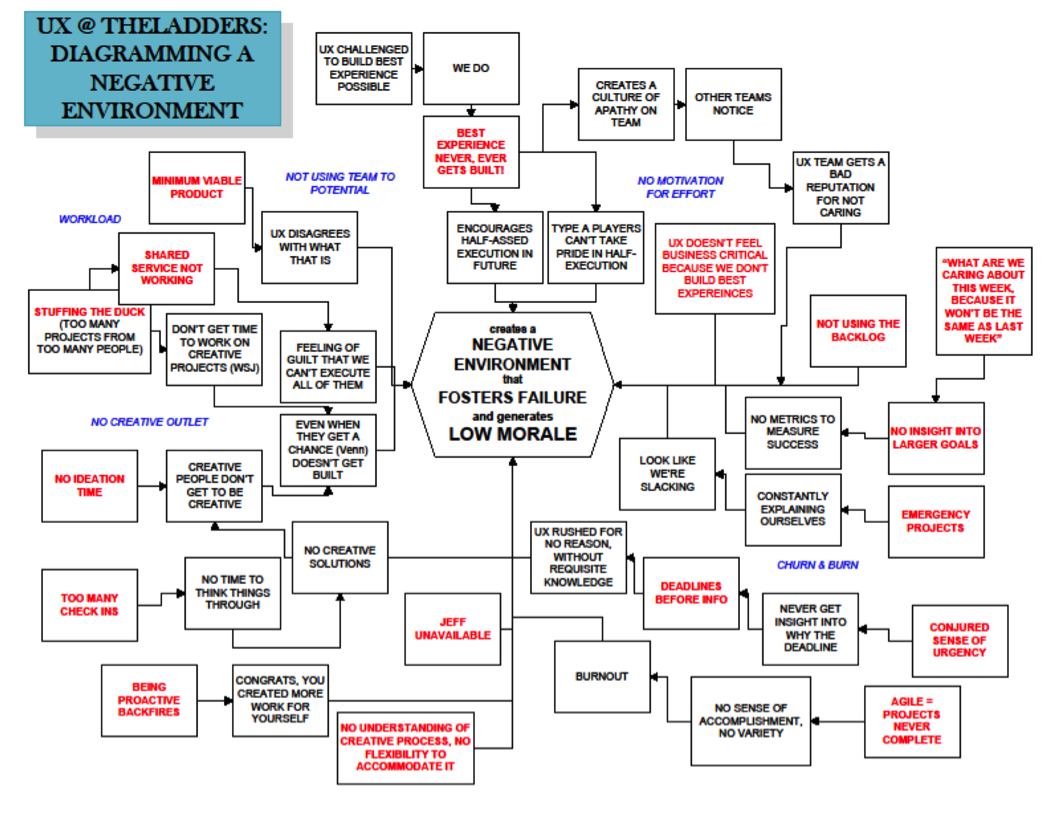 Integrating design into Agile development is never easy. Sometimes, it causes a lot of pain and heartache. Jeff learned that first-hand when he was at TheLadders. After spending some time trying to integrate UX work with an Agile process, Jeff was feeling pretty good—until one morning when his UX team delivered the diagram shown in Figure III-1. This diagram visualized all of the challenges the team was facing as they tried to integrate its practice into the Agile environment. It served, initially, as a large slice of humble pie. Ultimately, though, it provided the beginning of conversations that helped Jeff, his UX team, and the rest of TheLadders’ product development staff build an integrated, collaborative practice.