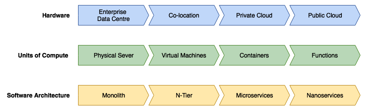 It's worth noting that, in all the examples in this book, there is still an underlying data center that has to be managed, but now we're talking about shifting that responsibility of management. In the preceding diagram, each stream of evolution is not tightly linked. For example, ...