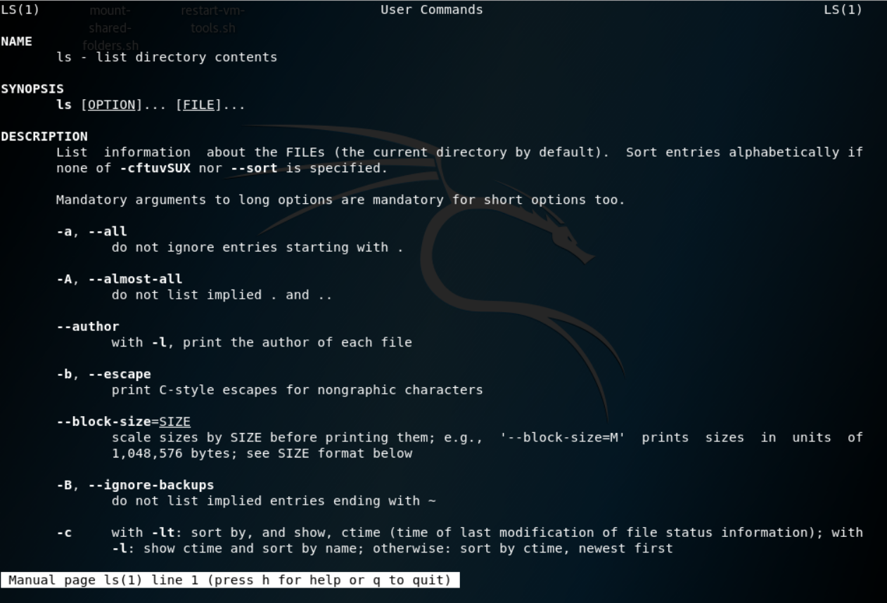 After running this command, it will show us the manual for the ls command. And, as we can see, it's showing us that ls is used to list content, because it lists files and directories. We can also see that this command actually takes options, so it takes more options than just the ls command: