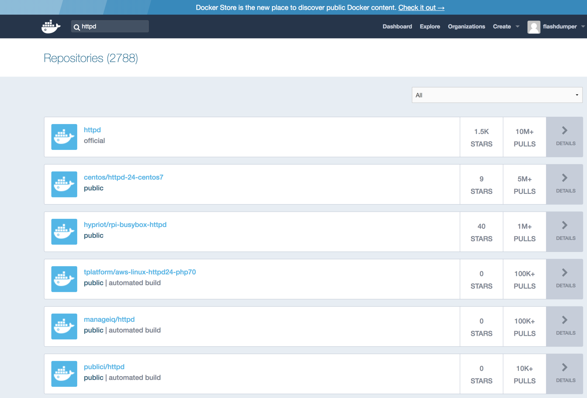 $ docker search httpdNAME DESCRIPTION STARS OFFICIAL AUTOMATEDhttpd ... 1569 [OK]hypriot/rpi-busybox-httpd ... 40centos/httpd 15 [OK]centos/httpd-24-centos7 ... 9