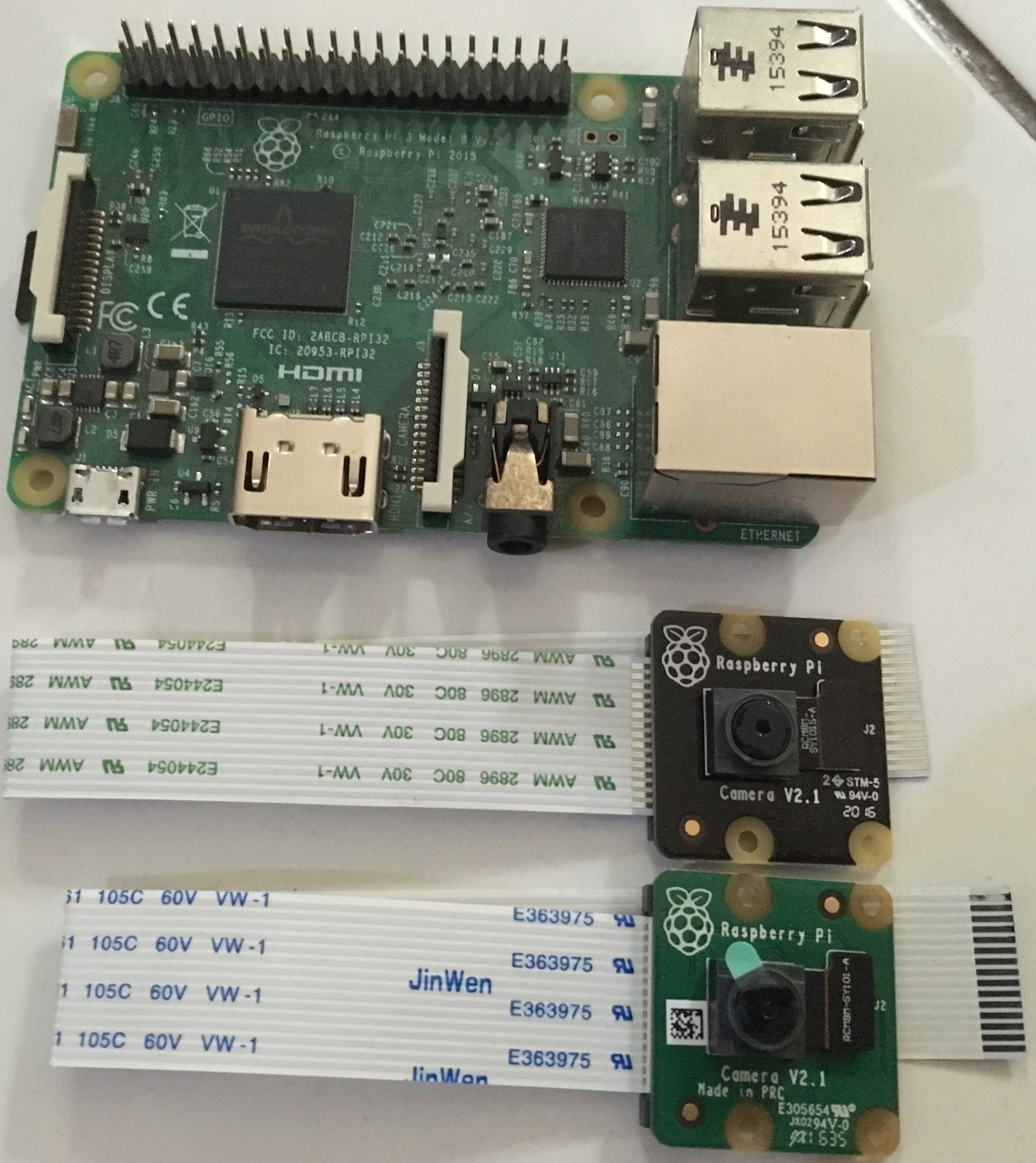 Raspberry Pi Foundation provides an official cameras for Raspberry Pi. A list of Raspberry Pi cameras can be found at https://www.raspberrypi.org/documentation/hardware/camera/README.md. I have two official camera modules from Raspberry Pi. They are Pi Camera v2 and Pi NoIR Camera v2. You can see them in the following image: