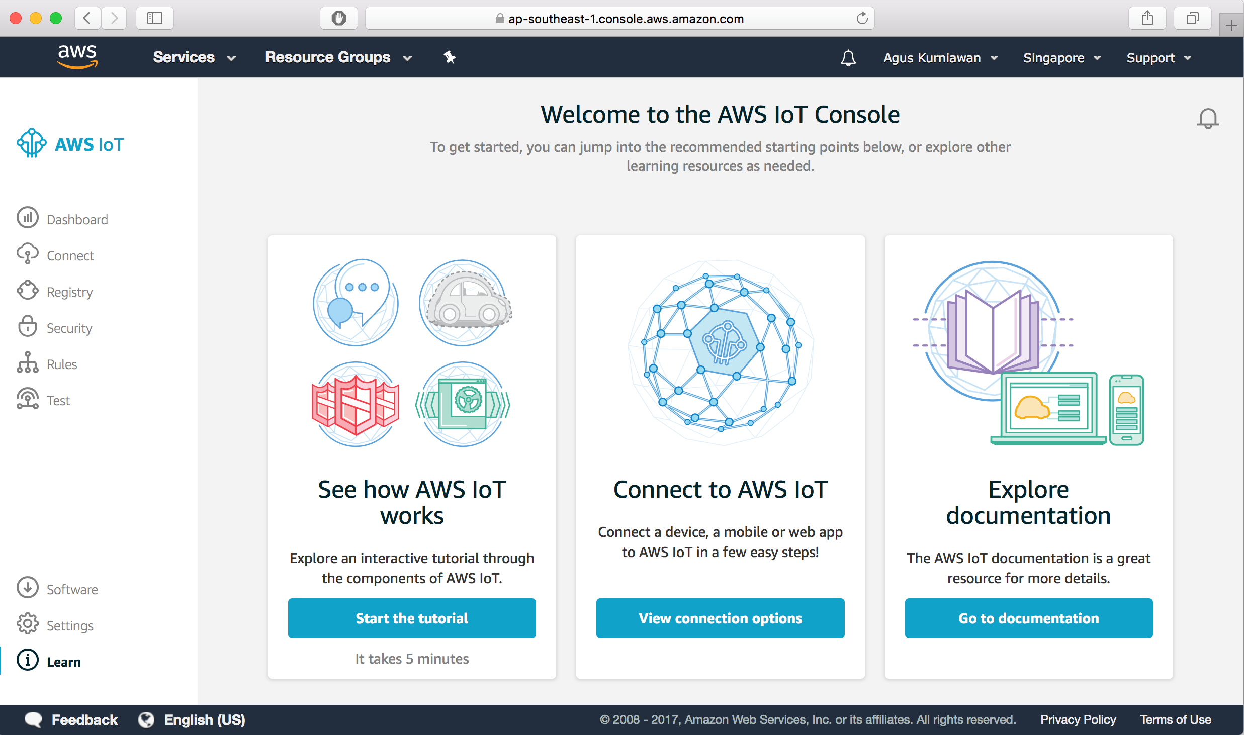 AWS IoT Management Console lets you access and manage AWS IoT through a simple and intuitive web-based user interface. This web console can be found at https://console.aws.amazon.com/iotv2/home. If you have an active AWS account, you should access a form of AWS IoT Management Console. A screen of AWS IoT Management Console is shown in the following screenshot: