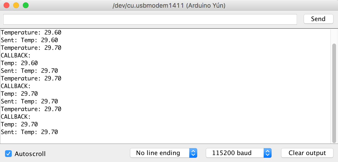 After we deploy the sketch program into Arduino Yún , you can run the sensor subscriber application first. Type the following command on your Terminal or Command Prompt for Windows: