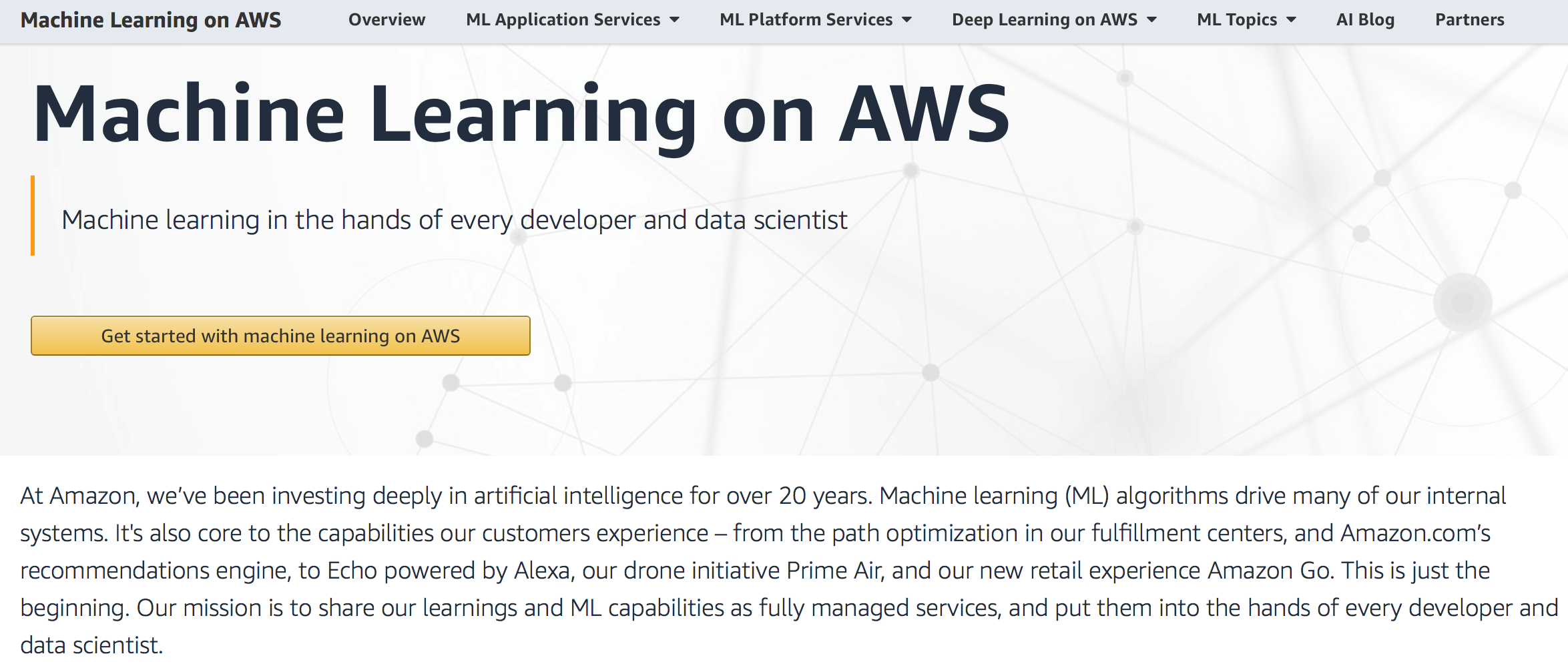 All AWS Machine Learning services can be found at https://aws.amazon.com/machine-learning/. At the time of writing this book, AWS Machine Learning services are available in any region. Make sure that you change AWS region in order to enable AWS Machine Learning services: