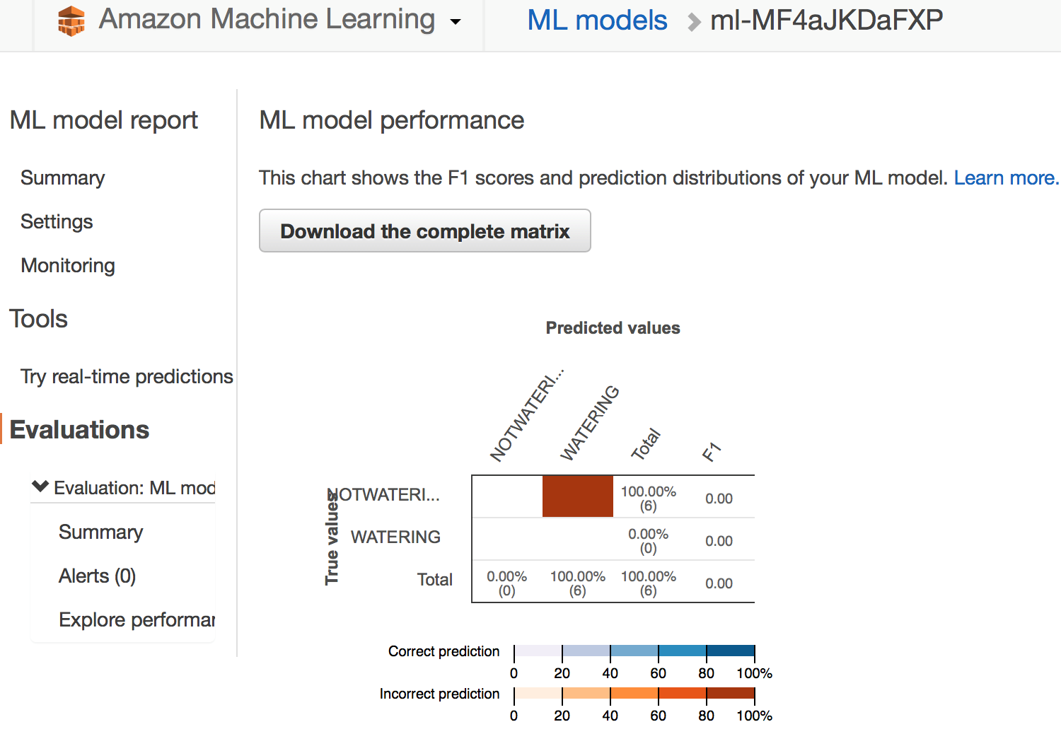 - You can click your model evaluation from the Amazon Machine Learning dashboard. After clicking, you should get a screen, as shown in the following screenshot. If you find a wrong result, you should modify the data and then create a model: