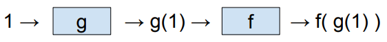 We input 1 to g and to express that as g(1). We input g(1) to f to get f(g(1)).
