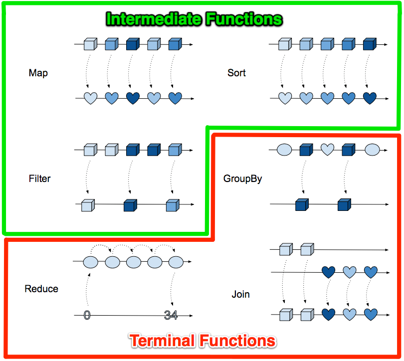 Look at the various intermediate and terminal functions in the following functor diagram. They are all functors. When a function, for example, Map, is provided with a set of values as input, it will apply a transformation on the elements and produce output that will be a different set of values.