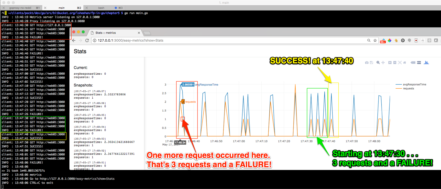 The next few screenshots will display our terminal console and our web browser at http://127.0.0.1:3000/easy-metrics?show=Stats immediately after executing Go's main.go command: