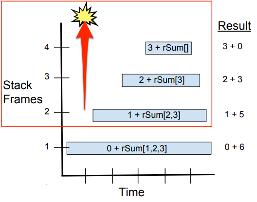 Each call to rSum needs to get the return value of the recursive call and add it to its x parameter before it can return. This means that each function must stay on the stack longer than the frame of any function that it calls. We had to create four stack frames to sum three numbers. Imagine the amount of RAM storage that this implementation will require ...