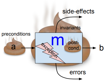 Our method m is passed an a, does some processing and returns b. An exception can occur, which may or may not be caught and handled and errors can be returned. Additionally, in order for the method to properly satisfy its contract, it's up to us to read the documentation (which of course will always be completely accurate and up-to-date.... not!) in hopes that we cover all the preconditions, invariant, and postconditions.