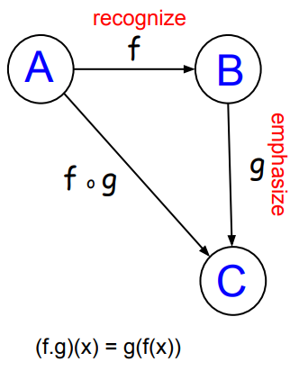 >We see that we can combine our functions f and g to get from A to B to C. Note that the order matters. We must first go from A to B via f and then from B to C via g.