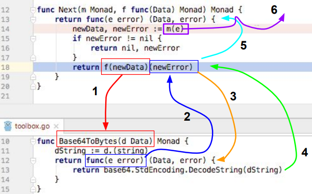 - Runtime execution returns to the return func(e error) (Data, error) line in Base64ToBytes and enters its code block, which is the return statement that ...