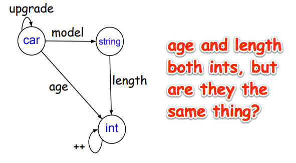 Here, we have two valid categories. The first one is of a car. The objects include the car itself, the car's model name, and the car's age. We show two identity morphisms. One arrow goes from a car to itself (upgrade a car and it's another car). The other arrow goes from the integer object to itself (the "++" operator means add one to the current value). We left off the arrow from the model name to itself, but it exists (a name is a name):=