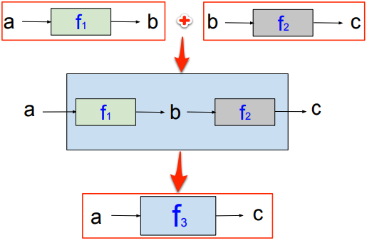 Function composition is where we combine two smaller functions to create a new function that accomplishes the same goal as the two smaller ones. Both ways get us from an a to c. Below, f1 accepts an a and returns a b. f2 accepts a b and returns a c. We can compose/combine those two functions and get a single function that accepts an a and returns a c: