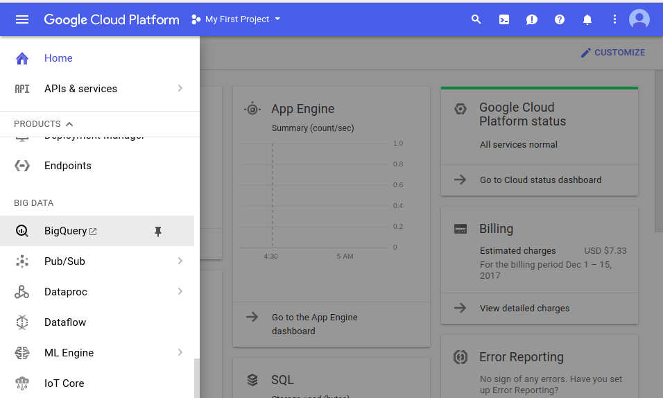 To execute the queries shown in the chapter open the BigQuery Console from the main menu as shown in the screenshot below. Click on the Compose Query button in the BigQuery Console to type the queries and execute it. More details about the BigQuery Console is explained in the beginning of the next chapter.