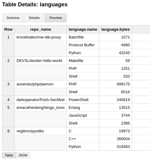 BigQuery supports the WITHIN clause, which can be used to query nested and repeated fields. The following screenshot shows how a repeated field looks; language is a repeated field with two columns, name and bytes: