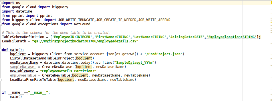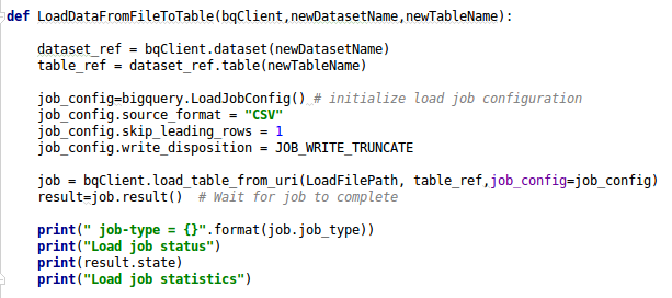 The following method imports data from a file in the Google Cloud Storage to the table under the specified dataset. The format of the file is assumed as CSV and the first row of the file is assumed to be the header row: