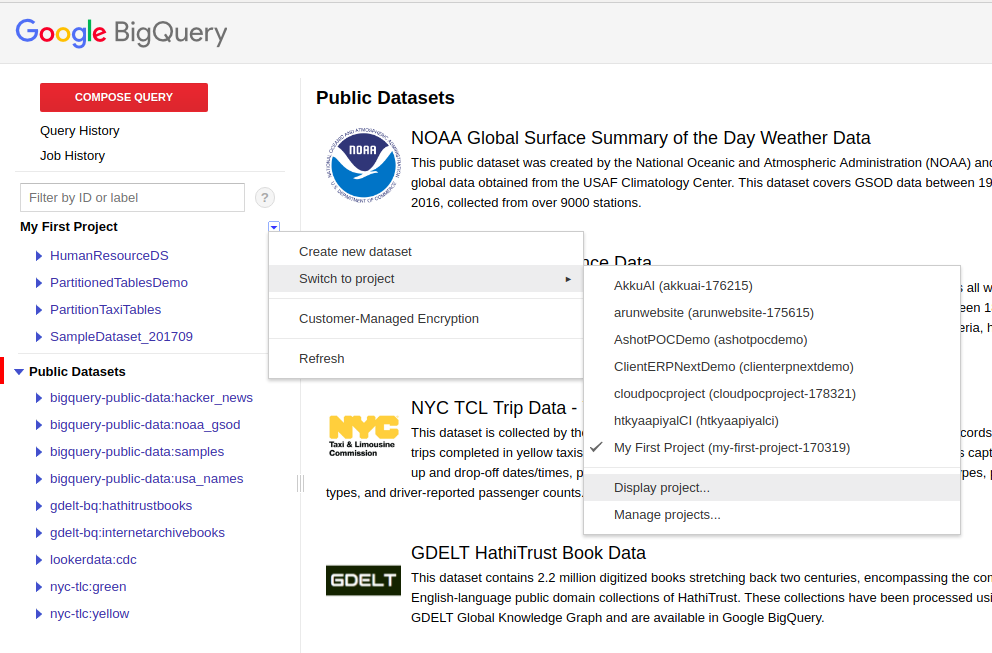 To navigate to the dataset, choose the Display Project option by opening the menu as shown here in the BigQuery web console screen: