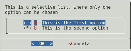 # dialog --radiolist "This is a selective list, where only one option can be chosen" 10 50 2 "a" "This is the first option" "off" "b" "This is the second option" "on"
