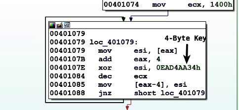 Attackers commonly use multi-byte XOR because it provides better defense against the brute-force technique. For example, if a malware author uses 4-byte XOR key to encrypt the data and then to brute-force, you will need to try 4,294,967,295 (0xFFFFFFFF) possible keys instead of 255 (0xFF) keys. The following screenshot shows the XOR decryption loop of the malware (Taidoor). In this case, Taidoor extracted the encrypted PE (exe) file from its resource section and decrypted it using the 4-byte XOR key 0xEAD4AA34:
