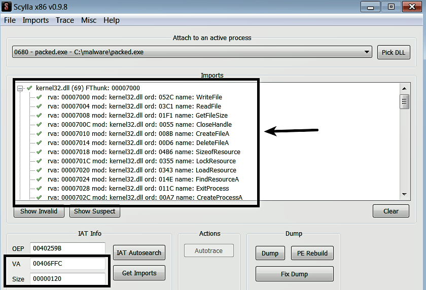 To fix the imports, go back to Scylla, and click on the IAT Autosearch button, which will scan the memory of the process to locate the import table; if found, it populates the VA and the size fields with appropriate values. To get the list of imports, click on the Get Imports button. The list of imported functions determined using this method is shown here. Sometimes, you may note invalid entries (with no tick mark next to the entry) in the results; in such case, right-click those entries and choose Cut Thunk to delete them: