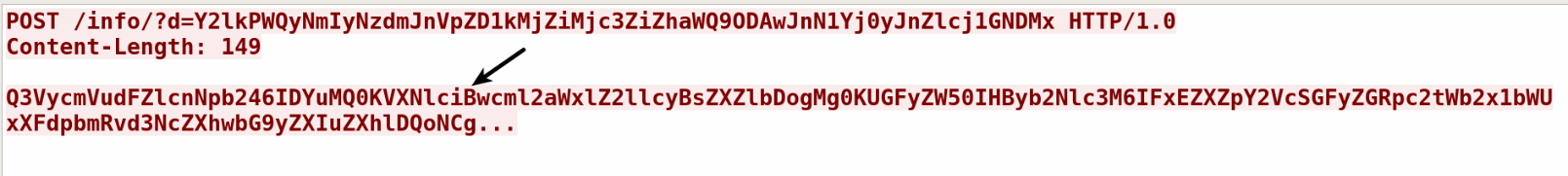 Some malware samples remove the padding character (=) from the end. A C2 communication made by a malware sample (Trojan Qidmorks) is shown later. The following post payload looks like it is encoded with base64 encoding:
