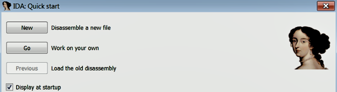 To load an executable, Launch IDA Pro (right-click and select Run as administrator). When you launch IDA, it will briefly display a screen showing your license information; immediately after that, you will be presented with the following screen. Choose New and select the file you wish to analyze. If you select Go, IDA will open the empty workspace. To load a file, you can either drag and drop or click on File | Open and select the file: