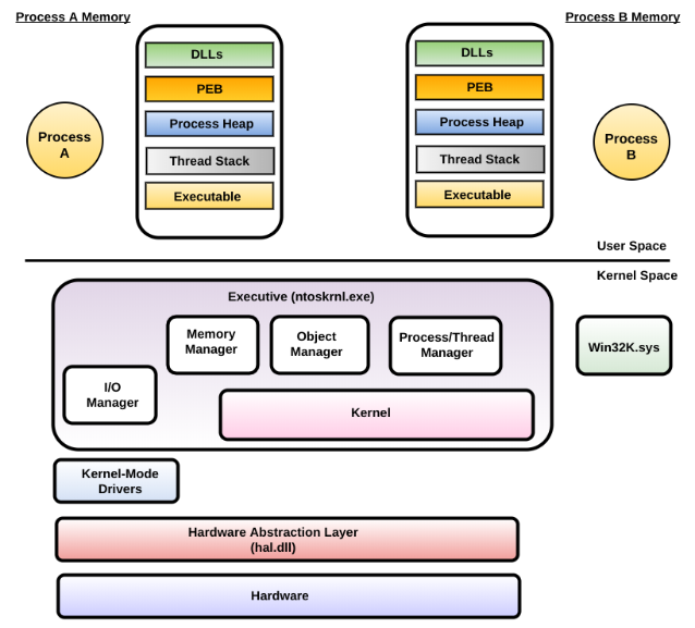 The kernel memory contains the operating system and the device drivers. The following screenshot shows the user-space and kernel space components. In this section, we will mainly focus on the kernel space components: