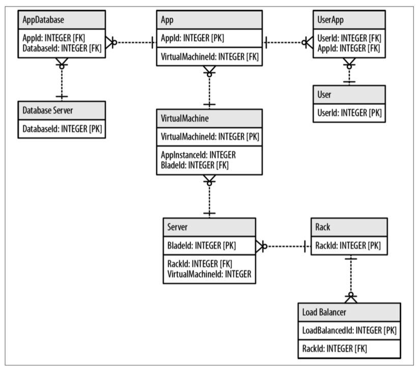 Let's take the model, which was described previously, to the database administrator for an actual implementation. What happens then is that, in this implementation, the relational model inherently causes complexity. What you can see in the following diagram is that, for every relationship where we can have n-n combinations, we actually need to introduce something that links the two tables together.