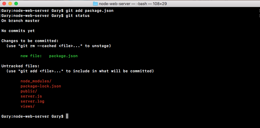 Now we have an Initial commit header. This is new, and we have our old Untracked files header. Notice under Untracked files, we don't have package.json anymore. That is moved up to the Initial commit header. These are ...