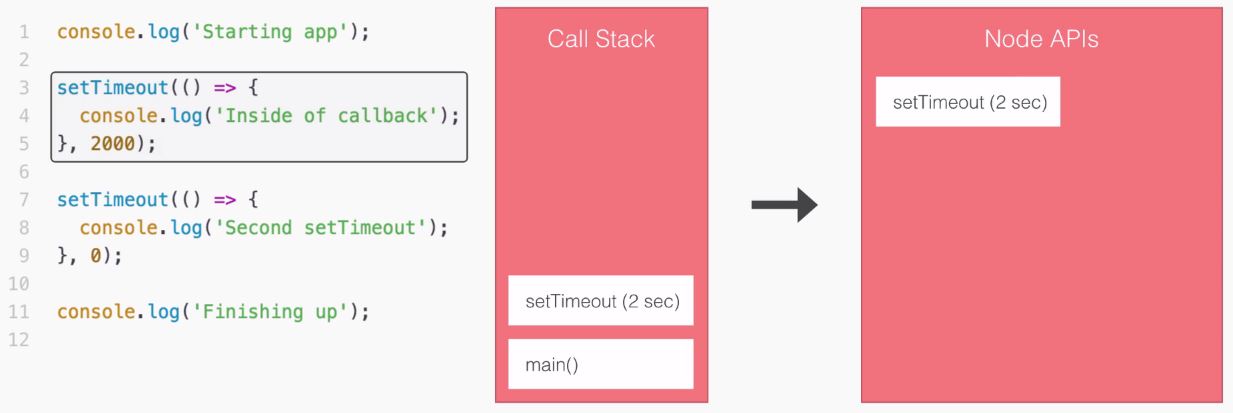 When we call the setTimeout (2 sec) function, we're actually registering the event callback pair in the Node APIs. The event is simply to wait two seconds, and the callback is the function we provided, the first argument. When we call setTimeout, it gets registered right in the Node APIs as shown here: