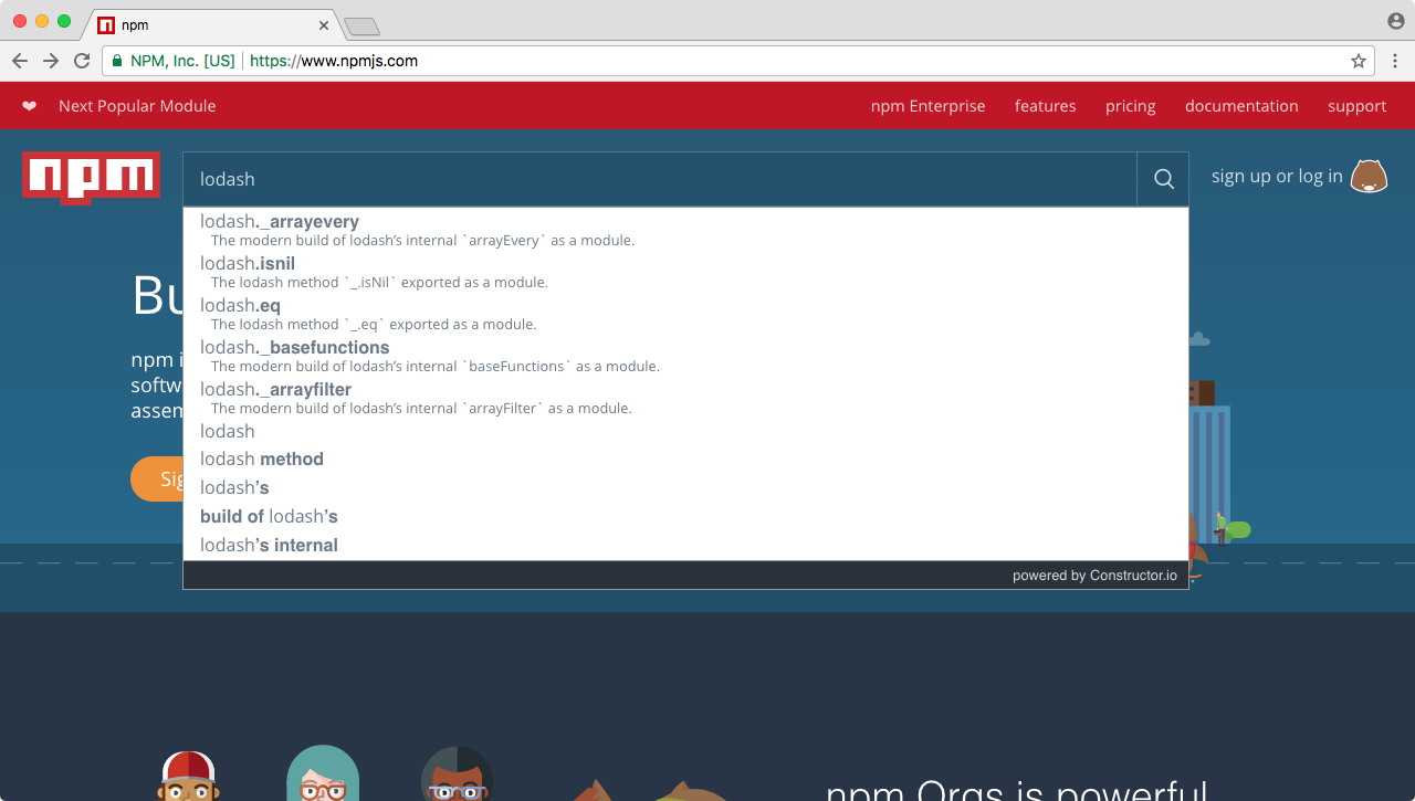 We'll to go to https://www.npmjs.com. Then we'll search for the package, lodash, and you can see it comes up, as shown in the following screenshot: