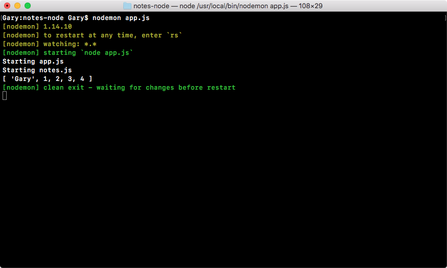 We'll see a combination of our app's output, along with nodemon logs that show you what's happening. As shown in the preceding code, you can see the version nodemon is using, the files it's watching, and the command it actually ran. Now, at this point, it's waiting for more changes; it already ran through the entire app and it'll keep running until another change happens or until you shut it down.