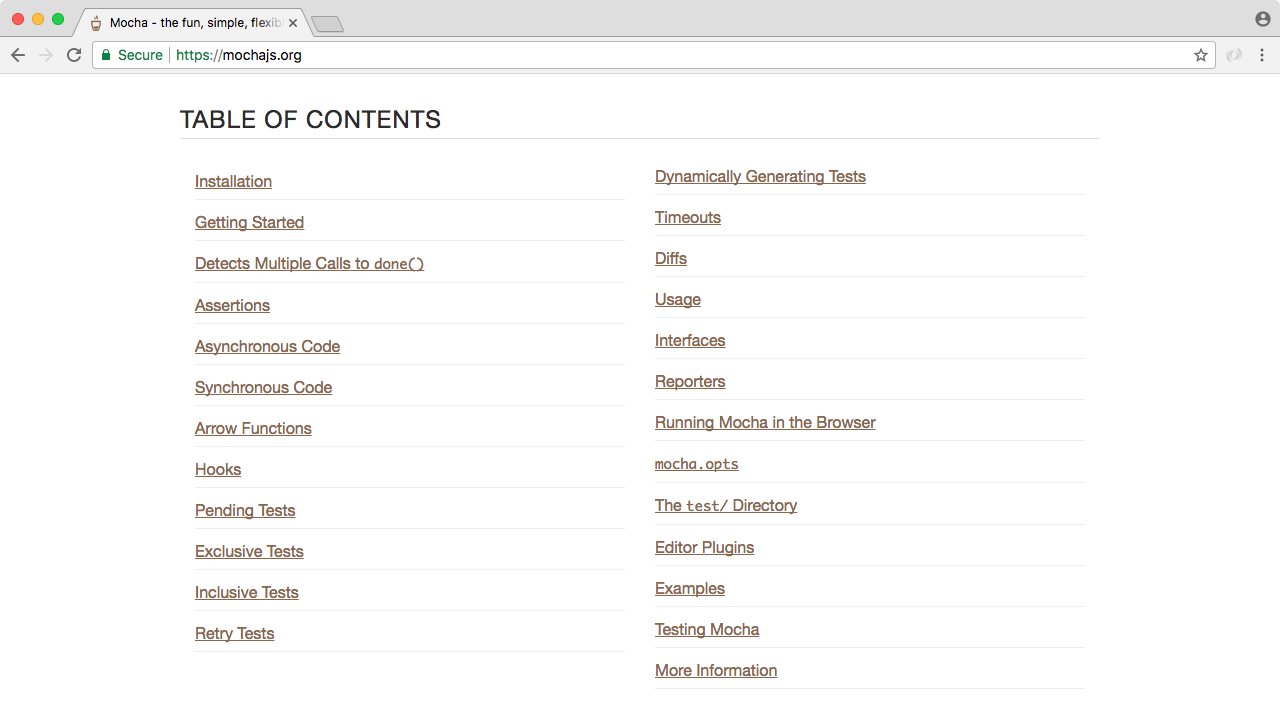 We'll be doing the testing using the super popular testing framework Mocha, which you can find at mochajs.org. This is a fantastic framework for creating and running test suites. It's super popular and their page has all the information you'd ever want to know about setting it up, configuring it, and all the cool bells and whistles it has included:
