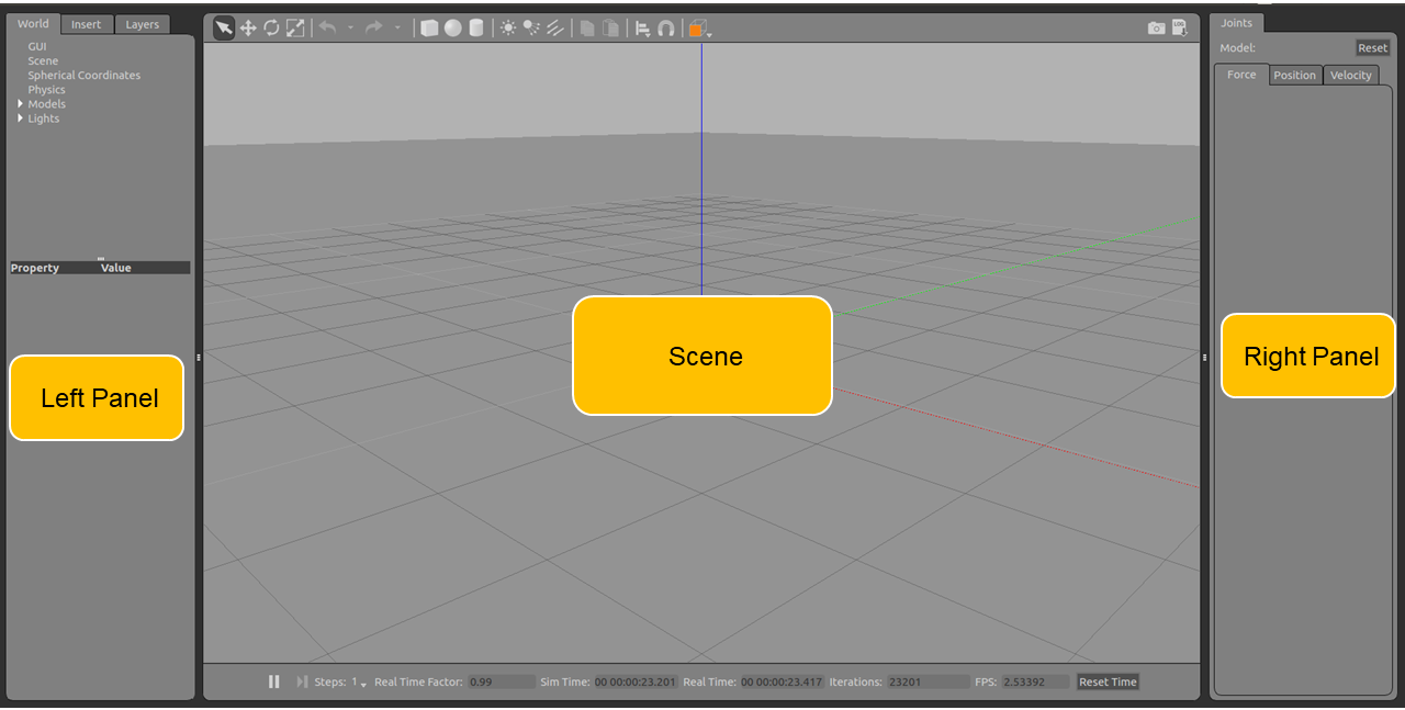 The Gazebo user interface can be divided into three sections: Scene, Left Panel, and the Right Panel.