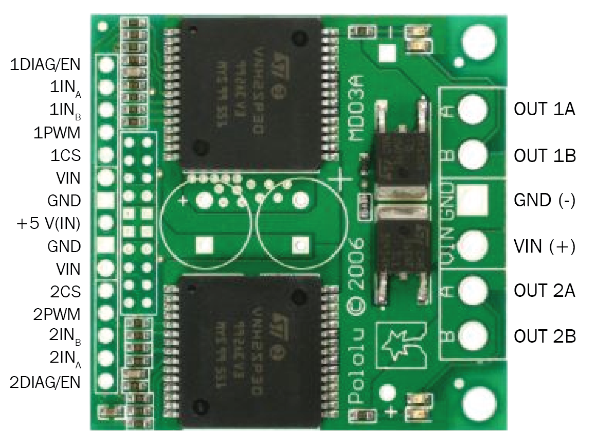 This driver can drive two motors with a maximum current rating of 30 A, and contains two integrated ICs for driving each of the motors. The pin description of this driver is given in the upcoming sections.
