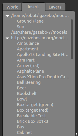- Insert: The Insert tab allows you to add a new simulation model to the Scene. The models are available in the local system, as well as the remote server. The /home/<user_name>/.gazebo/model folder will keep the local model files and models in the remote server in http://gazebosim.org/models, as shown in the following screenshot: