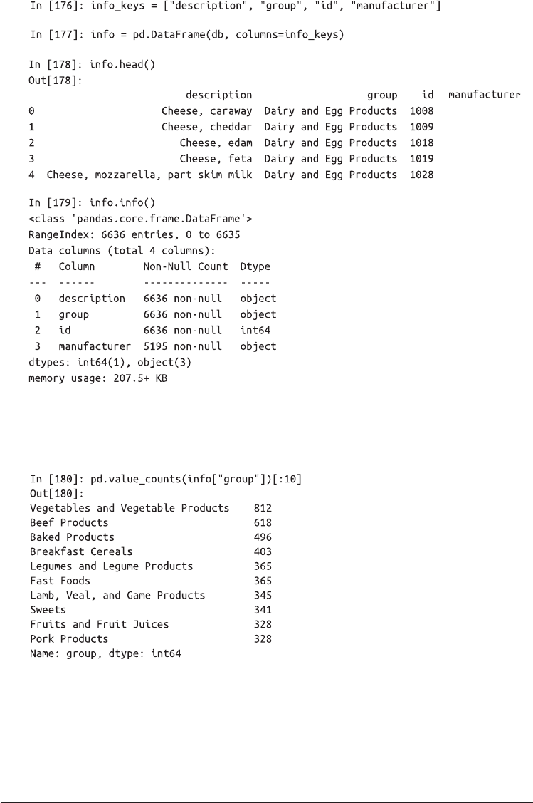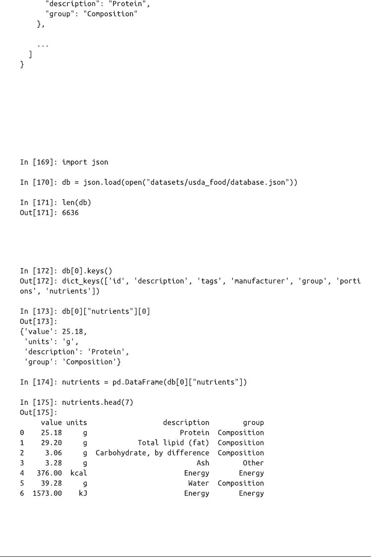 db 中的每个条目都是一个字典,含有某种食物的全部数据。字段 "nutrients" 是一个字